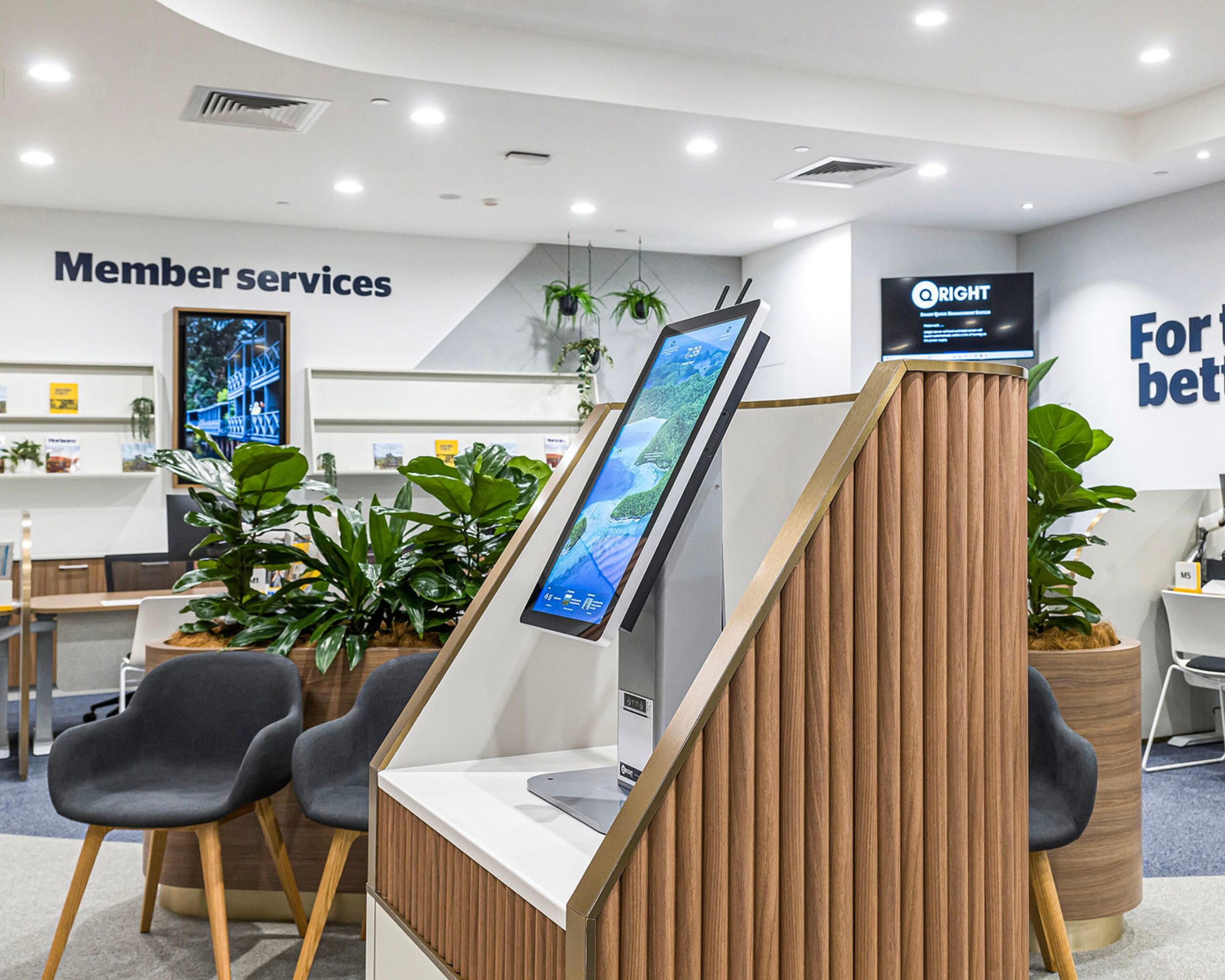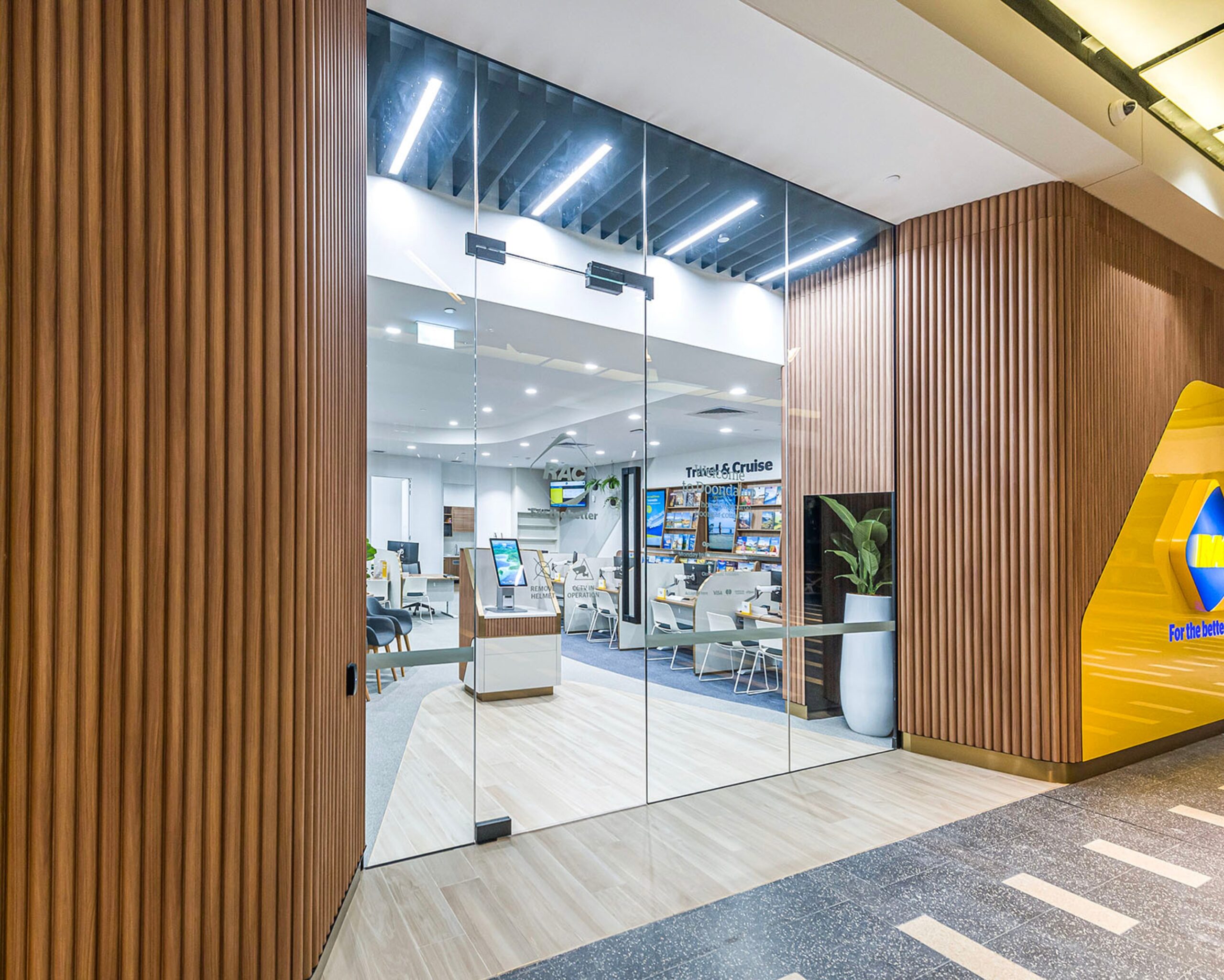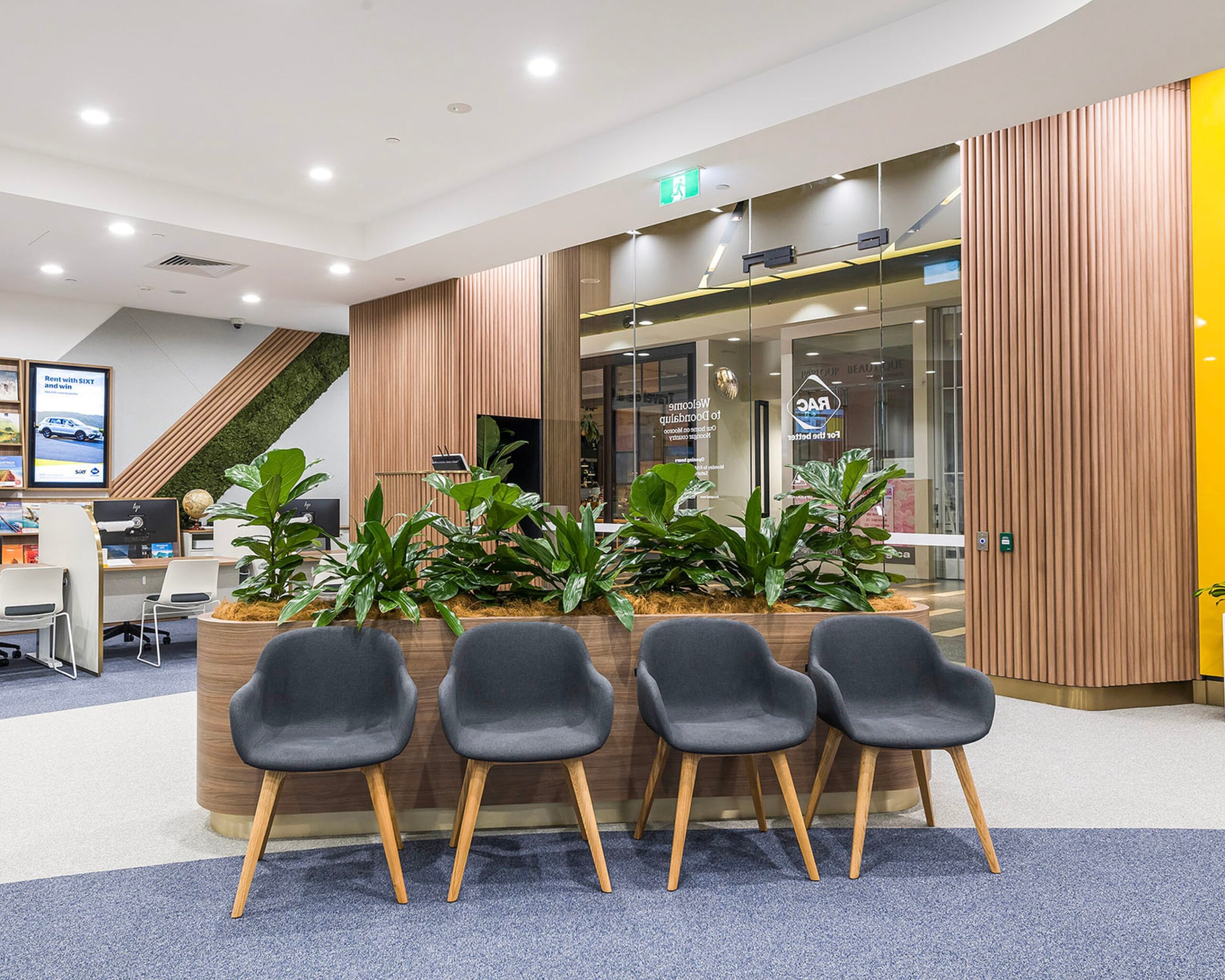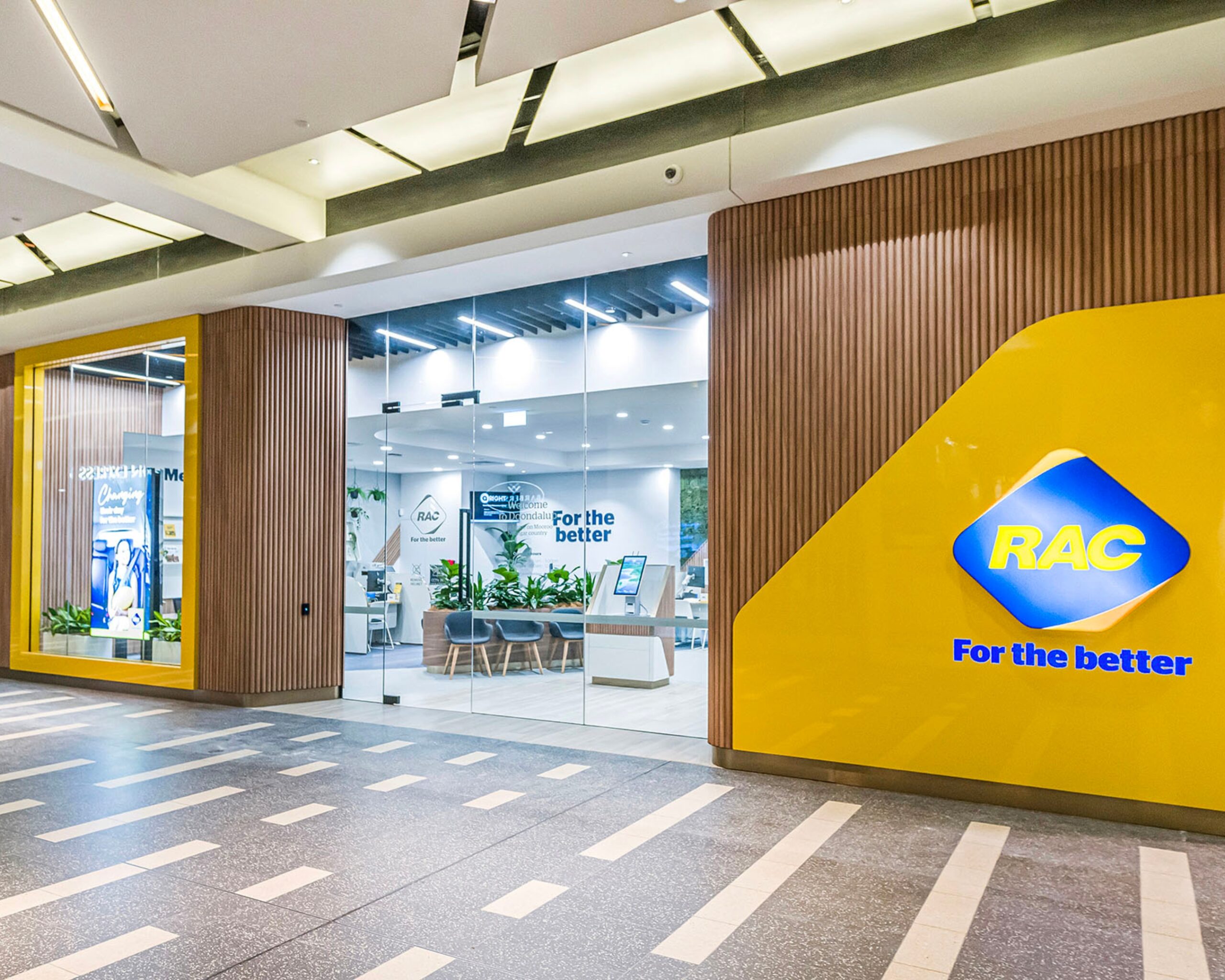 At the new RAC store, design is in the details — curved joinery inspired by the RAC logo, to acoustic panels, moss walls, and natural greenery that bring texture and freshness. Yellow accents complete the space, seamlessly tying the fit-out back to the brand.